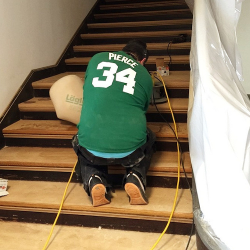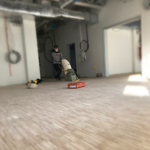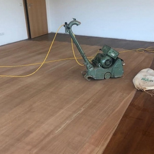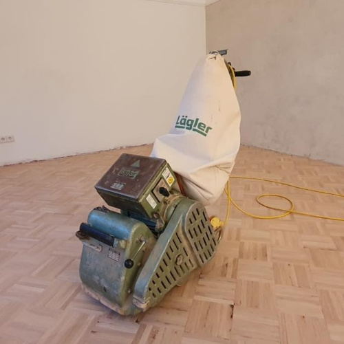 - Abschleifen: Der Boden wird mit professionellen Maschinen abgeschliffen, um alte Versiegelungen, Kratzer und Flecken zu entfernen.